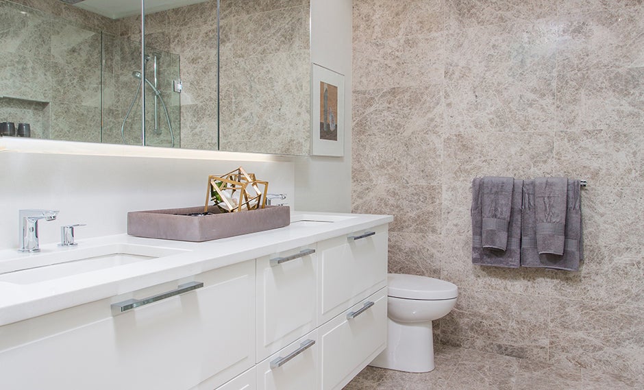 - Step into an oasis in the master ensuite bathroom, which features imported marble floor tiles, floating cabinets and a European-style thermostatic shower featuring marble floor tiles, a ceiling rain shower head, a built-in niche for toiletries and integrated bench seating