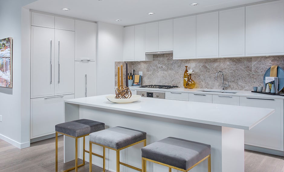 - Smart contemporary kitchens with polished stone countertops with waterfall edges, a full-height tile backsplash, custom cabinets and stainless steel appliances inspire culinary adventures and gourmet gatherings